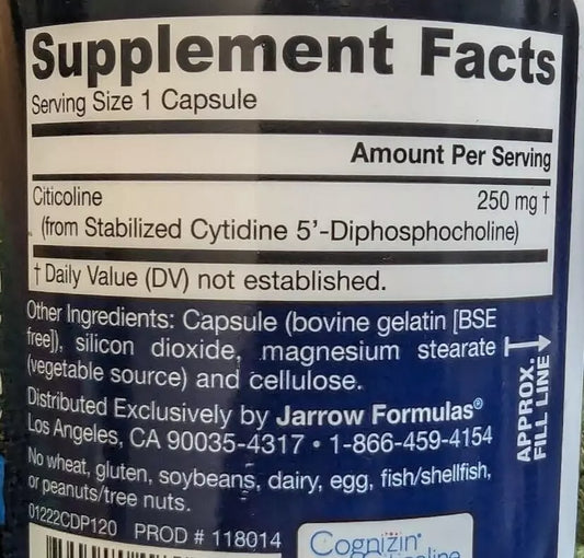 Jarrow Formulas Citicoline CDP Choline 250 mg 120 Capsules EXP 7/24 For Brain